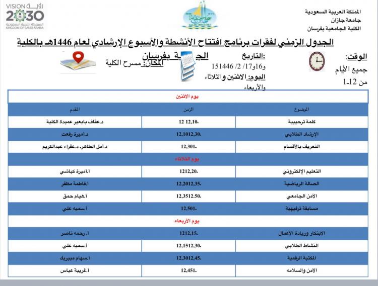 فعلت الكلية الجامعية بجزر فرسان برنامجها الإرشادي التعريفي للطالبات المستجدات للعام الجامعي 1446هـ ـ 1447هـ برعاية عميدة الكلية الدكتورة عفاف محمد بابعير وإشراف وكيلة الكلية للشؤون الأكاديمية الدكتورة منال الحازمي وحضور جميع وكلاء الوحدات ورئيسات الأقسام والهيئة التدريسية والإدارية، بواقع ثلاثة أيام على التوالي في مسرح الكلية.