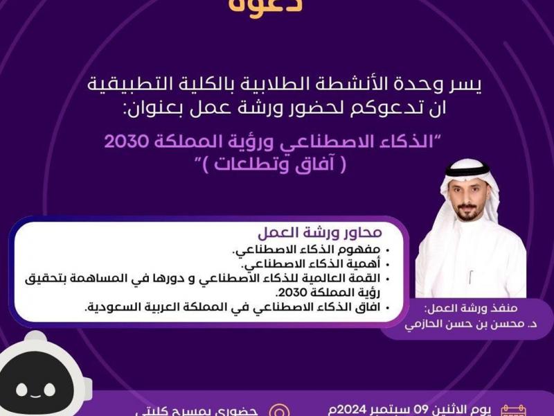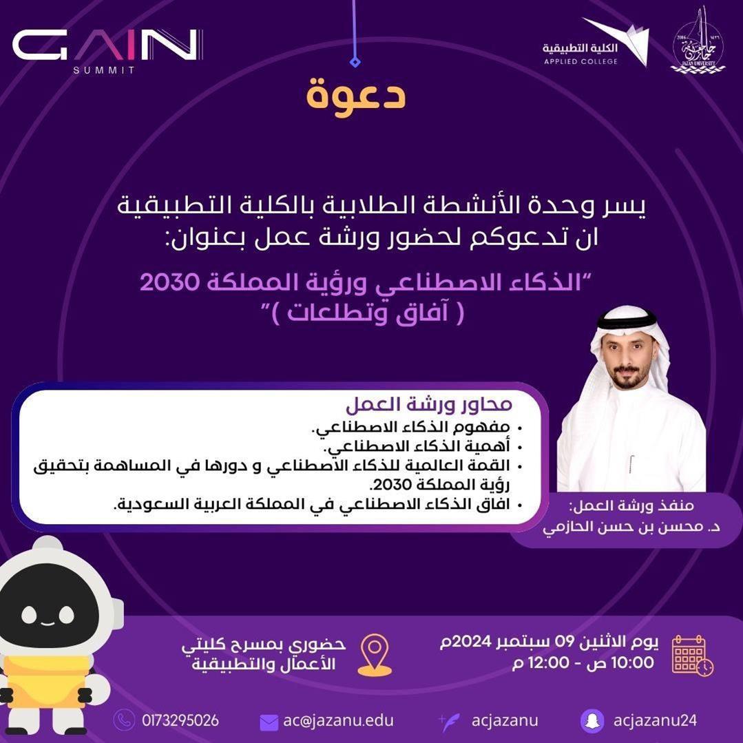 وشهد اليوم الثاني بالكلية التطبيقية تقديم ورشة عمل بعنوان (الذكاء الاصطناعي ورؤية المملكة 2030 (آفاق وتطلعات)، نفذها الدكتور محسن بن حسن الحازمي، بمقر مسرح كليتي الأعمال والتطبيقية، بحضور الرئيس التنفيذي في الكلية التطبيقية الدكتور وليد عبده زعقان ورؤساء الأقسام وأعضاء هيئة التدريس وطلاب الكلية، تحدث فيها عن مفاهيم الذكاء الاصطناعي وأهمية القمة العالمية للذكاء الاصطناعي ودورها المساهم في تحقيق رؤية المملكة 2030، كما أستعرض آفاق الذكاء الاصطناعي في المملكة العربية السعودية.