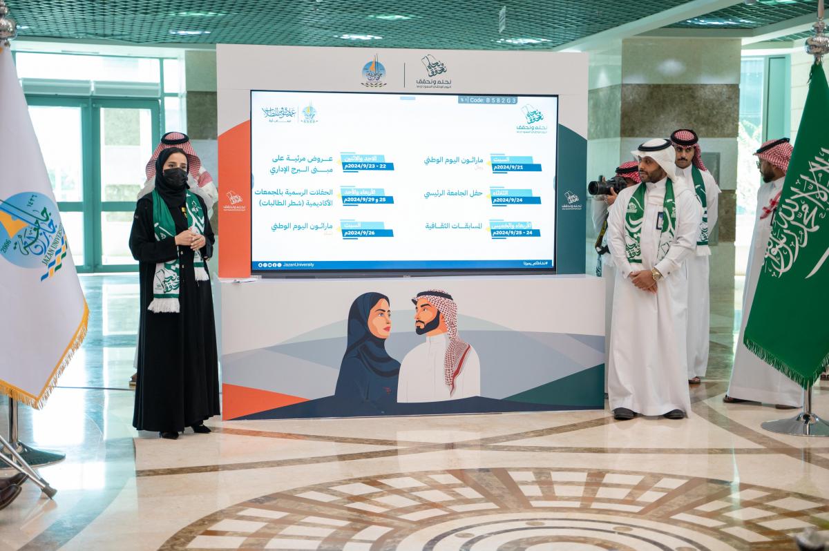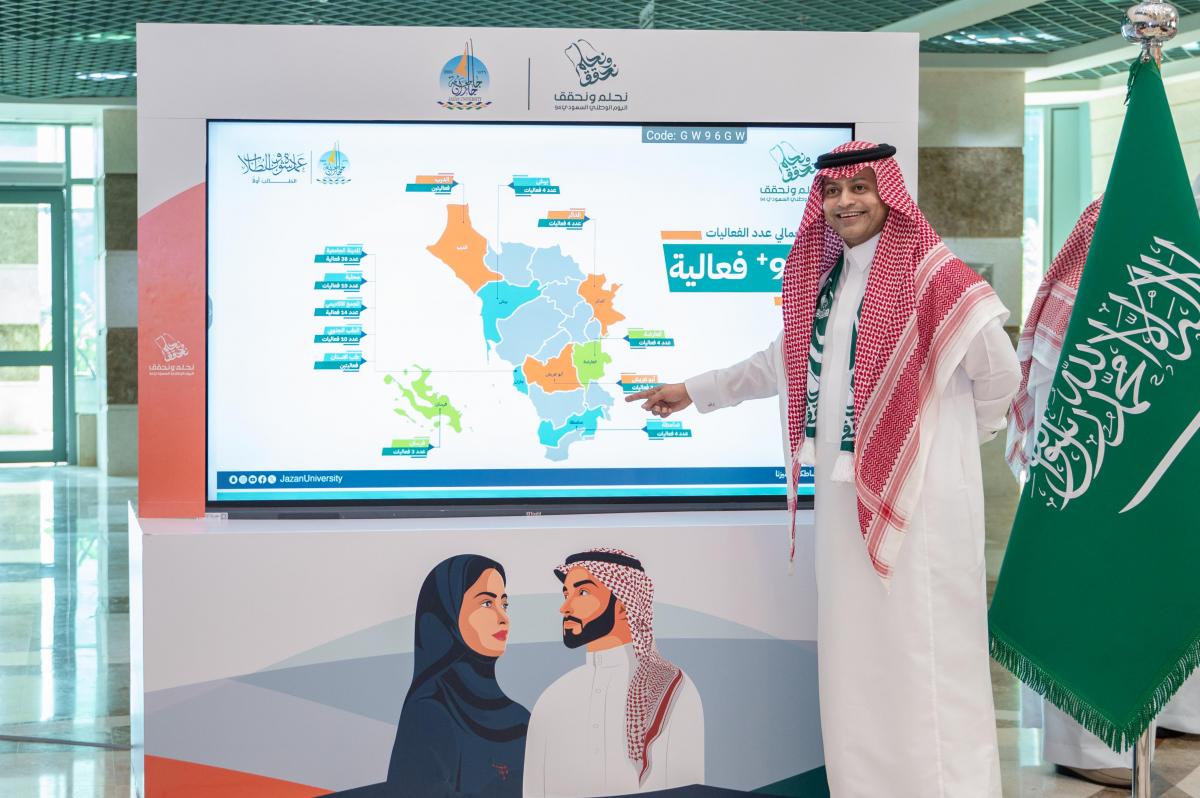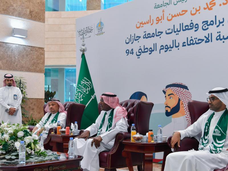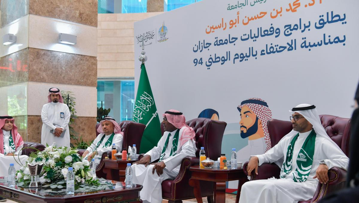 أطلق سعادة رئيس جامعة جازان الأستاذ الدكتور محمد بن حسن أبو راسين ظهر اليوم بالبرج الإداري فعاليات وبرامج الجامعة التي ينفذها طلبة ومنسوبو الجامعة احتفاء بذكرى اليوم الوطني السعودي 94، بحضور وكلاء الجامعة والطلبة وأعضاء اللجنة الدائمة للبرامج والفعاليات الوطنية والثقافية.