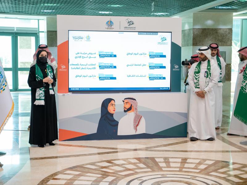 فيما أوضح عميد شؤون الطلاب الدكتور يحيى فقيهي رئيس اللجنة الدائمة للبرامج والفعاليات الوطنية والثقافية أن الإعداد لهذه المناسبة تم منذ وقت مبكر، مضيفاً أن برنامج الاحتفاء سيشهد تنظيم أكثر من 94 فعالية تشمل الفعاليات المركزية كالمارثون الوطني للرجال بعد غد السبت، والعروض المرئية أمام برج الجامعة الإداري يومي الأحد والاثنين، و إقامة حفل الجامعة الرئيسي يوم الأربعاء، إلى جانب تنفيذ الندوات التاريخية والوطنية، والمسابقات الرياضية والثقافية من الثلاثاء إلى الخميس وتختتم الفعاليات المركزية بالمارثون الوطني للنساء السبت من الأسبوع المقبل.