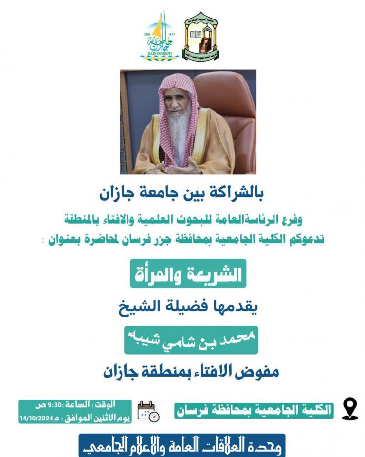استضافت الكلية الجامعية بفرسان فضيلة الشيخ محمد بن شامي شيبة مفوض الإفتاء بمنطقة جازان وذلك في إطار الشراكة بين جامعة جازان وفرع الرئاسة العامة للبحوث العلمية والإفتاء بالمنطقة.