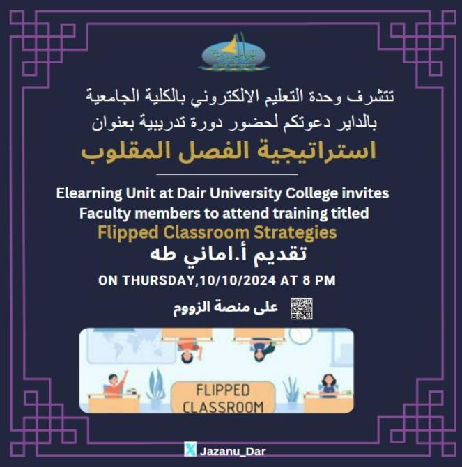 من جانب آخر أقامت الوحدة ورشة عمل عبر تطبيق زووم بعنوان استراتيجيات الفصل المعكوس قدمتها الدكتورة أماني عوض، حيث تناولت موضوع نموذج الفصل الدراسي المعكوس، والذي يركز على نقل التدريس المباشر خارج الفصل الدراسي واستخدام وقت الفصل في الأنشطة التفاعلية التي تركز على الطالب.