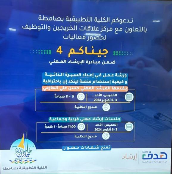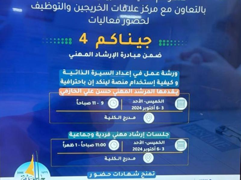 نفذت الكلية التطبيقية بصامطة بالتعاون مع مركز علاقات الخريجين والتوظيف بالجامعة عدد من ورش العمل ضمن مبادرة الإرشاد المهني جيناكم٤ من تقديم المرشد المهني حسن الحازمي، وذلك على مدار يومين تضمنت الورش مواضيع إعداد السيرة الذاتية وكيفية استخدام منصة لينكد إن باحترافية.