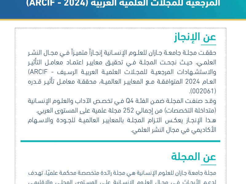 في إنجاز جديد لجامعة جازان في مجال النشر العلمي، حققت مجلة جامعة جازان للعلوم الإنسانية معايير اعتماد معامل التأثير والاستشهادات المرجعية للمجلات العلمية العربية "أرسيف- ARCIF " لعام 2024م.