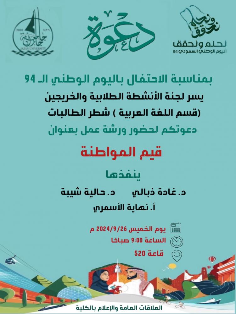 فعل قسم اللغة العربية بكلية الفنون والعلوم الإنسانية شطر الطالبات بالتزامن مع احتفالات اليوم الوطني ورشة عمل بعنوان "قيم المواطنة " نفذتها الدكتورة غادة ذبالي والدكتورة حالية شيبة والدكتورة مي محمود، والدكتورة نهاية الأسمري عضوات هيئة التدريس بالقسم بحضور وكيلة الكلية الدكتورة فاطمة بريك ومنسوبات الكلية والطالبات.