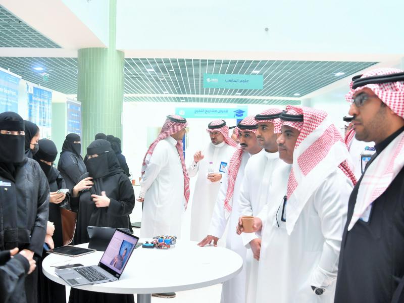 واستمع الدكتور خبراني إلى ملخص عن المشاريع من قبل الطلاب والطالبات، كما كرم أصحاب المراكز الأولى من كل قسم من أقسام الكلية.