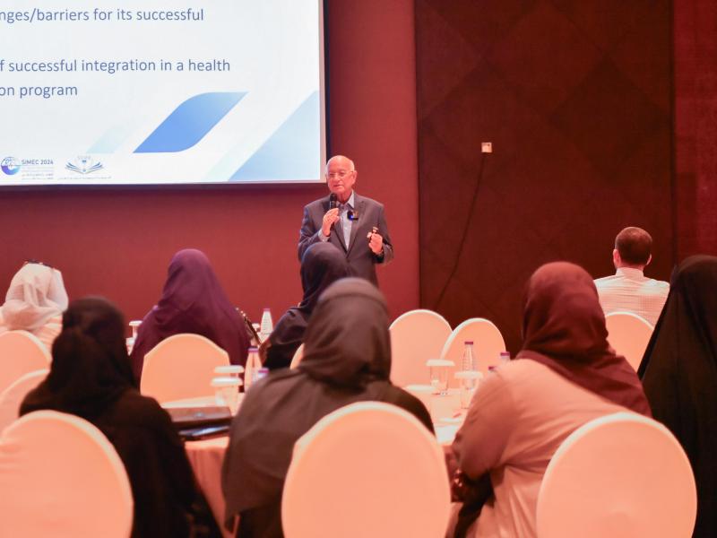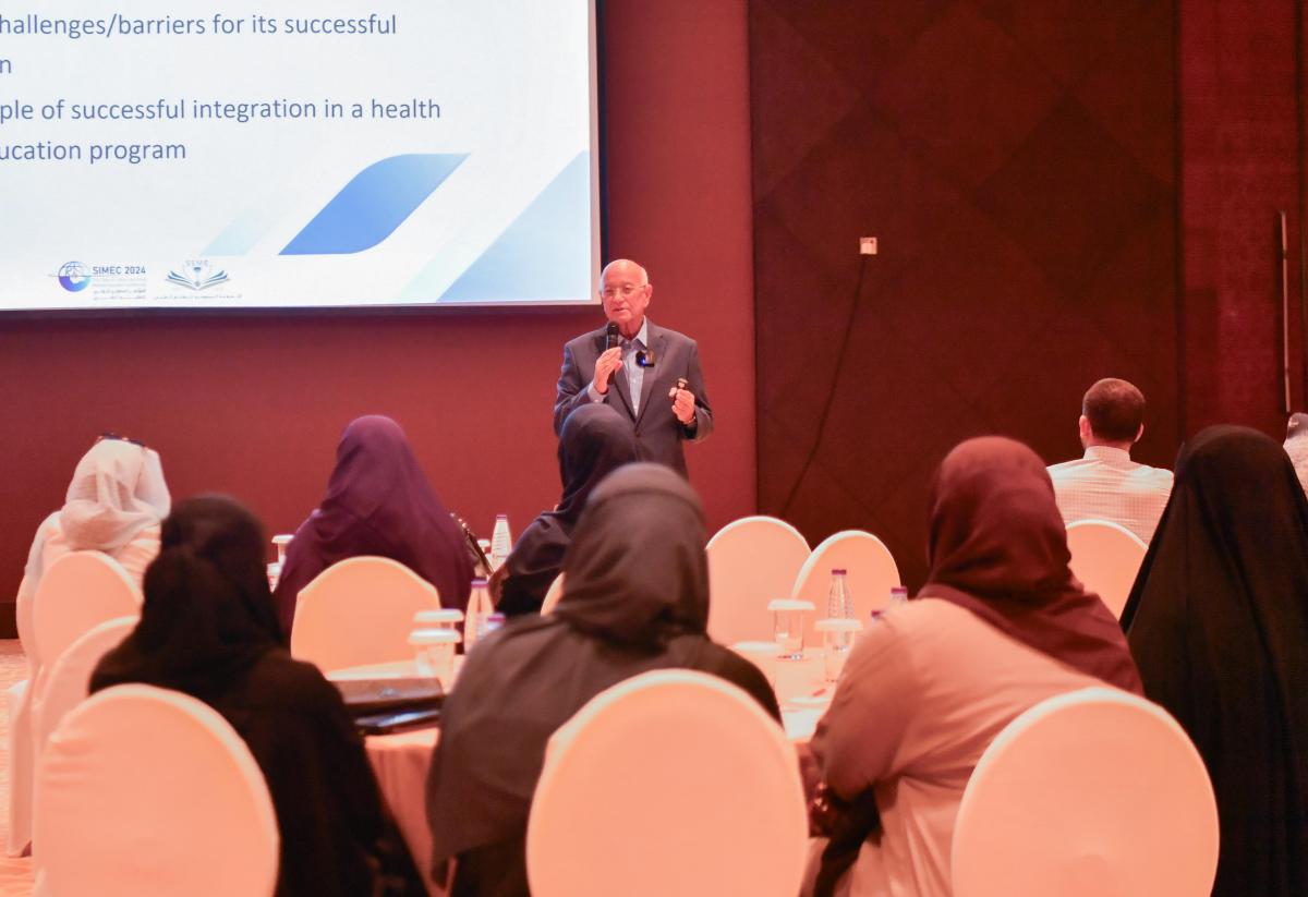وتواصلت ورش المؤتمر في الحديث حول موضوع دمج التعليم الطبي المبني على المحاكاة في المناهج الحالية قدمها الأستاذ الدكتور عبد العزيز محمد بوكر أستاذ واستشاري في تخدير وطب العناية المركزة ورئيس مجلس إدارة الجمعية السعودية لمحاكاة الرعاية الصحية وأمين لجنة عمداء كليات الطب في المملكة.
