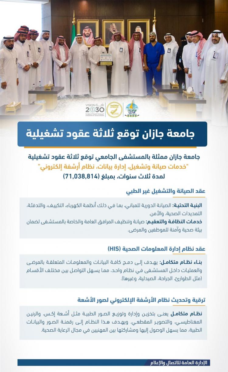 أكد سعادة رئيس جامعة جازان الأستاذ الدكتور محمد بن حسن أبوراسين على الدعم الذي تحظى به الجامعة من قبل القيادة الرشيدة، مشيرًا إلى أن المستشفى الجامعي يسهم في تقديم الخدمات الطبية النوعية والمتميزة، موجهًا باستمرار استكمال التجهيزات والتوسع في التشغيل الطبي و تجويد الخدمات، مشيدًا بالعقود التشغيلية التي وقعت مؤخرا والتي تضمنت عقد الصيانة والتشغيل غير الطبي وعقد نظام إدارة المعلومات الصحية وعقد ترقية وتحديث نظام الأرشفة الإلكتروني لصور الأشعة.