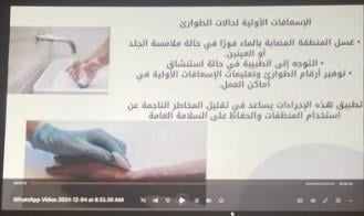 كما تمت إقامة ورشة تدريبية حول الصحة والسلامة المهنية بالتعاون مع إدارة السلامة والوقاية من الإشعاع لتعليم العاملات كيفية التعامل مع المواد الكيميائية وطرق الوقاية من المخاطر الصحية أثناء العمل، بالإضافة إلى تدريبهن على الوقاية من الأمراض المزمنة مثل آلام الظهر وأمراض التنفس الناتجة عن التعرض للمواد المنظفة، نفذتها منسقة الصحة والسلامة المهنية أ. هالة بنت محمد جيشي.