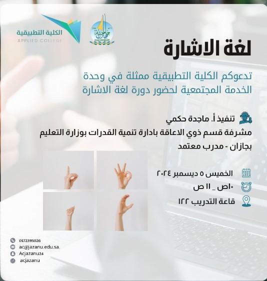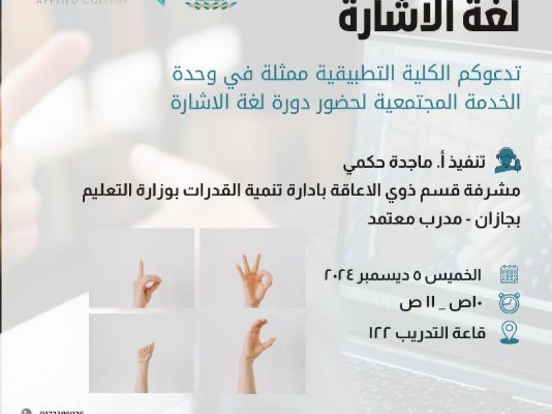 نظمت الكلية التطبيقية بجازان ممثلة بوحدة الخدمة المجتمعية دورة تدريبية لموظفات الكلية والطالبات تحت عنوان: (لغة الإشارة)، قدمتها المشرفة لذوي الإعاقة في قسم تنمية القدرات بوزارة التعليم الأستاذة ماجدة حكمي.