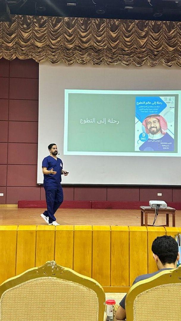 نظمت كلية طب الأسنان ورشة عمل بمناسبة يوم التطوع السعودي والعالمي قدمها الدكتور موسى شبير وتناولت أهمية العمل التطوعي في تعزيز القيم الإنسانية وتطوير المجتمع، مع تقديم أمثلة حية على تجارب تطوعية ناجحة.