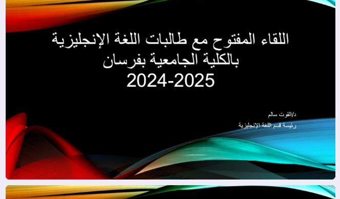 اللقاء المفتوح مع رئيسة قسم اللغة الإنجليزية الدكتورة القوت سالم وطالبات القسم في قاعة التدريب بالكلية وتم الترحيب والتعارف، بعدها دارت المناقشة حول عدد من المواضيع الأكاديمية والمناهج الدراسية، والتقييم، وتم مناقشة التحديات والمقترحات، والتأكيد على ضرورة الالتزام بالزي المناسب.