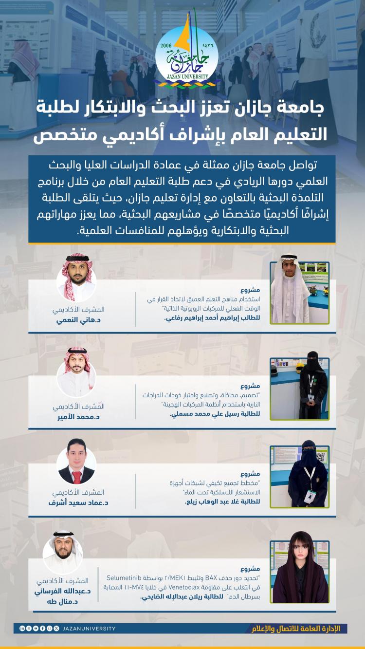 ويعكس هذا الإشراف الأكاديمي المتكامل التزام جامعة جازان بتقديم الدعم العلمي المستمر لطلبة التعليم العام، من أجل تعزيز ثقافة البحث والابتكار، وإعداد جيل قادر على المساهمة في التقدم العلمي والتقني، تحقيقًا لأهداف رؤية المملكة 2030 في تمكين الشباب وتطوير قطاع البحث العلمي.