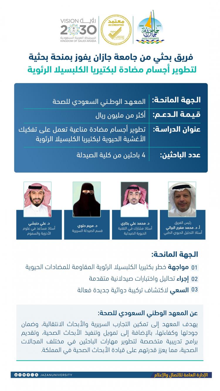 فاز فريق بحثي من كلية الصيدلة بجامعة جازان بمنحة بحثية تتجاوز قيمتها مليون ريال، مقدمة من المعهد الوطني السعودي للصحة، لدراسة تحمل عنوان “تطوير أجسام مضادة مناعية تعمل على تفكيك الأغشية الحيوية لبكتيريا الكلبسيلا الرئوية”.
