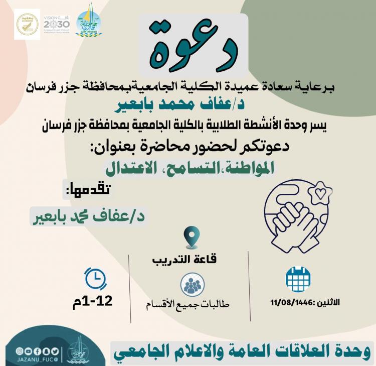 أقامت الكلية الجامعية بفرسان ممثلة في وحدة الأنشطة الطلابية بالتعاون مع وحدة العلاقات العامة برعاية عميدة الكلية الدكتورة عفاف محمد محاضرة بعنوان المواطنة التسامح والاعتدال من إعداد وتنفيذ عميدة الكلية الدكتورة عفاف با بعير ودارت محاور المحاضرة في عدة نقاط أبرزها ( مفهوم وأهمية المواطنة ، أصناف المواطنين ، دور المملكة في تعزيز الوطنية)