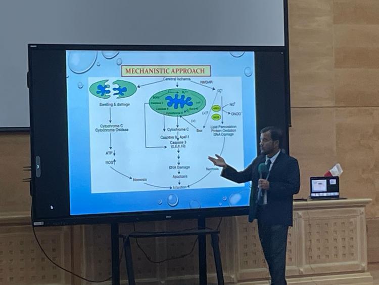 أقام مركز البحوث الصحية بجامعة جازان محاضرة علمية بعنوان "فهم السكتة الدماغية النخاعية الدماغية: النموذج والتشخيص والوقاية والأساليب العلاجية الحالية"، قدمها الدكتور محمد أشفاق، عضو هيئة التدريس بكلية الصيدلة وباحث بمركز البحوث الصحية وإدارة الجلسة الأستاذ الدكتور علي زربان من قسم علم الأدوية والسموم بكلية الصيدلة.