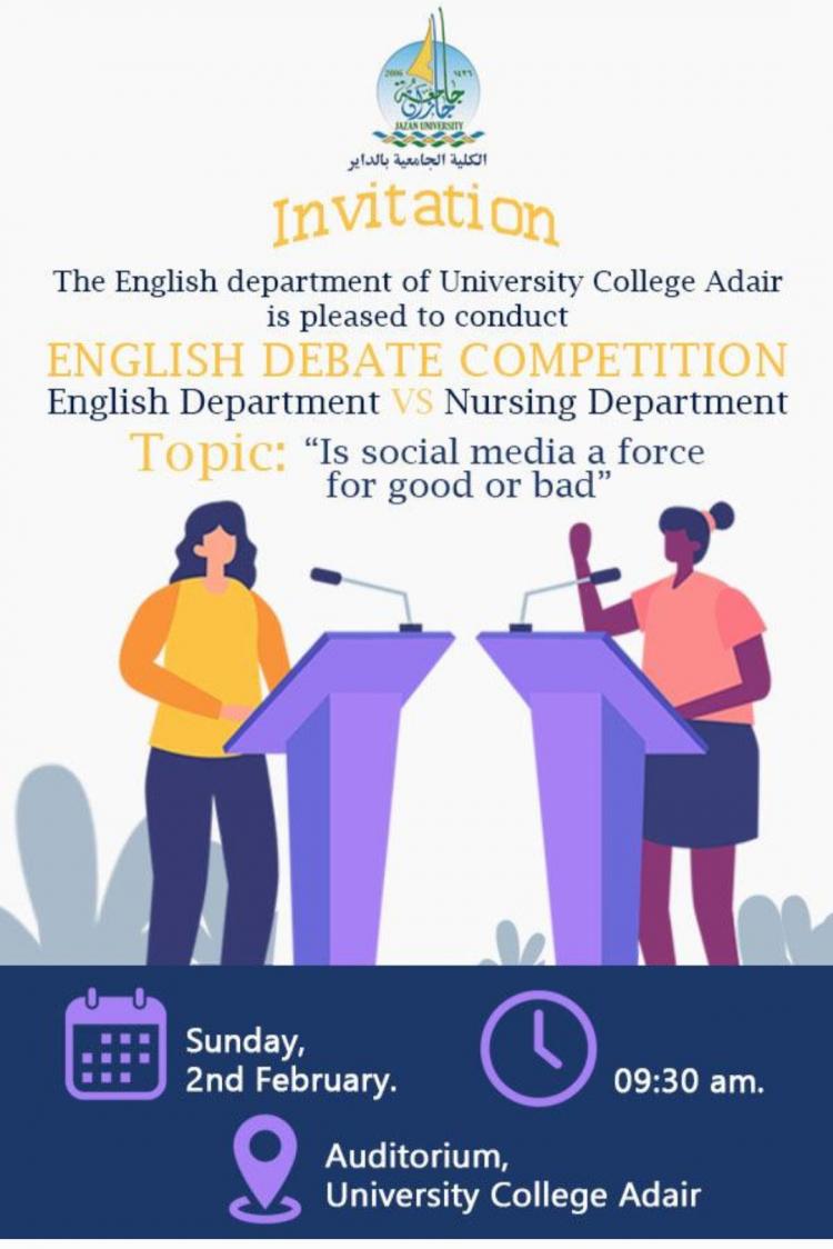 ففي المرحلة الأولى من المسابقة تم عمل مناظرة باللغة الإنجليزية عن موضوع "وسائل التواصل الاجتماعي بين الإيجابيات والسلبيات" حيث فاز قسم اللغة الإنجليزية بإقناع اللجنة المحكمة والحضور.