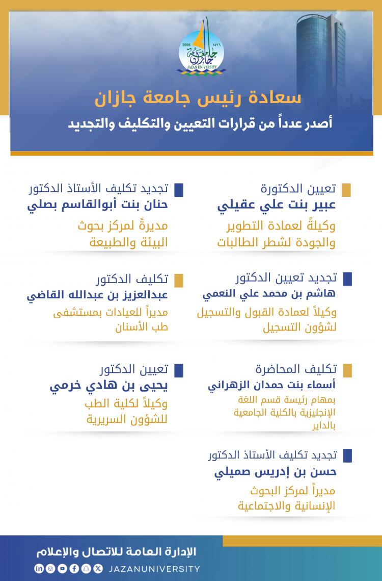وقد شملت القرارات ما يلي: تعيين الدكتورة عبير بنت علي عقيلي وكيلةً لعمادة التطوير والجودة لشطر الطالبات، تجديد تعيين الدكتور هاشم بن محمد علي النعمي وكيلاً لعمادة القبول والتسجيل لشؤون التسجيل، تكليف المحاضرة أسماء بنت حمدان الزهراني بمهام رئيسة قسم اللغة الإنجليزية بالكلية الجامعية بالداير، تجديد تكليف الأستاذ الدكتور حسن بن إدريس صميلي مديرًا لمركز البحوث الإنسانية والاجتماعية، تجديد تكليف الأستاذة الدكتورة حنان بنت أبوالقاسم بصلي مديرةً لمركز بحوث البيئة والطبيعة، تكليف الدكتور عبدالعزيز بن عبدالله القاضي مديرًا للعيادات بمستشفى طب الأسنان، تعيين الدكتور يحيى بن هادي خرمي وكيلاً لكلية الطب للشؤون السريرية.