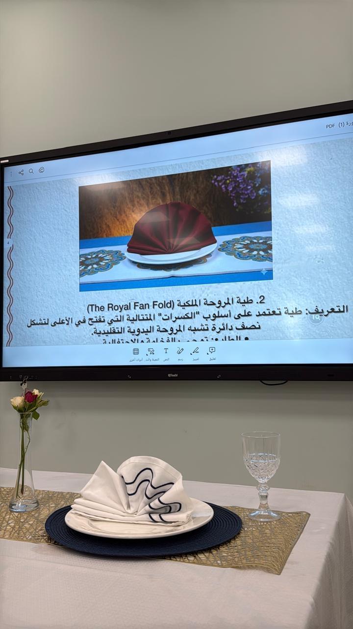 وهدفت الورشة إلى تنمية مهارات الطالبات في فنون تقديم الأطباق بأساليب مبتكرة تجمع بين الجمال والاحترافية، حيث تم استعراض عدد من تقنيات تزيين المائدة، ومن أبرزها طي المناديل بأشكال فنية تضيف لمسة جمالية لتجربة تقديم الطعام.
