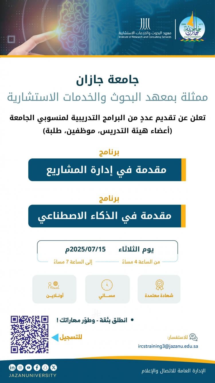 أعلنت جامعة جازان ممثلةً في معهد البحوث والخدمات الاستشارية، عن تقديم عدد من البرامج التدريبية الموجهة لمنسوبي الجامعة من أعضاء هيئة التدريس والموظفين والموظفات، إضافة إلى الطلاب والطالبات، وذلك ضمن جهود الجامعة لتعزيز المهارات المهنية والمعرفية.