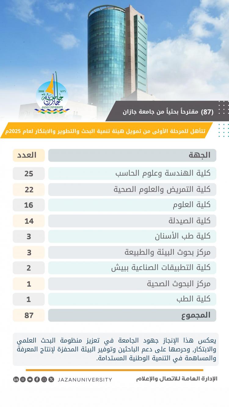 في إطار استراتيجيتها البحثية الطموحة، أعلنت جامعة جازان عن اجتياز 87 مشروعاً بحثياً من مقترحات منسوبيها للمرحلة الأولى من التمويل المقدم من هيئة تنمية البحث والتطوير والابتكار لعام 2025، موزعة على كليات ومراكز الجامعة، بما يعكس حرص الجامعة على تشجيع باحثيها ودعم مشاركتهم في البرامج الوطنية الموجهة نحو القضايا ذات الأولوية الوطنية والتنمية المستدامة.