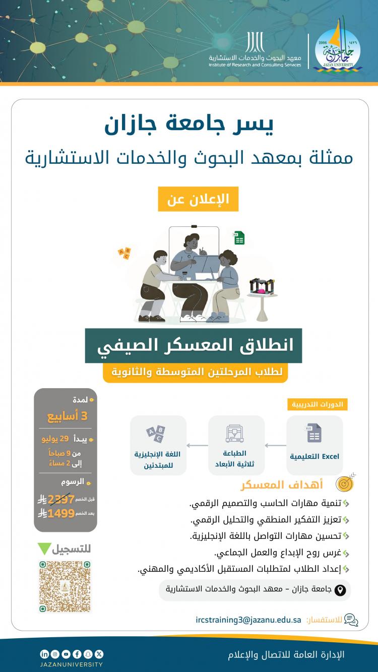 أعلن معهد البحوث والخدمات الاستشارية بجامعة جازان عن إطلاق معسكر صيفي تدريبي مكثف يستهدف طلاب وطالبات المرحلتين المتوسطة والثانوية، بهدف تزويدهم بالمهارات الرقمية والتقنية واللغوية الأساسية التي تؤهلهم لمواجهة متطلبات الحياة الجامعية وسوق العمل بفعالية وكفاءة.