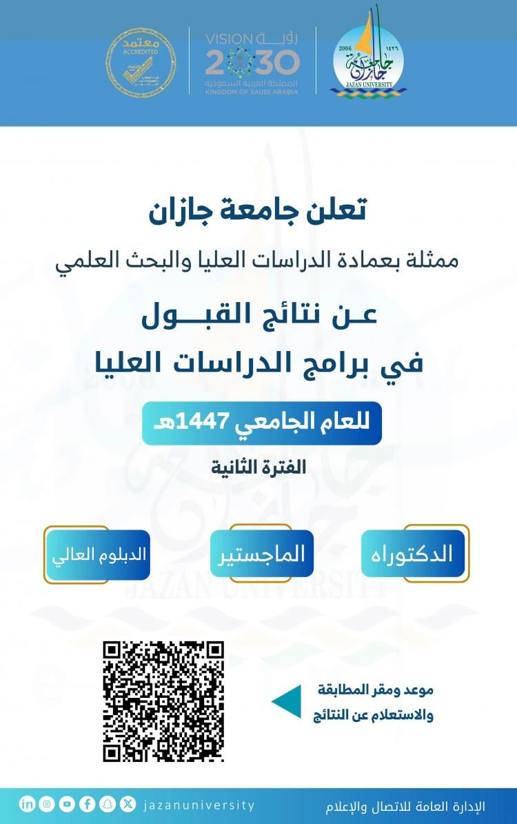 جامعة جازان تعلن نتائج القبول في برامج الدراسات العليا للفترة الثانية