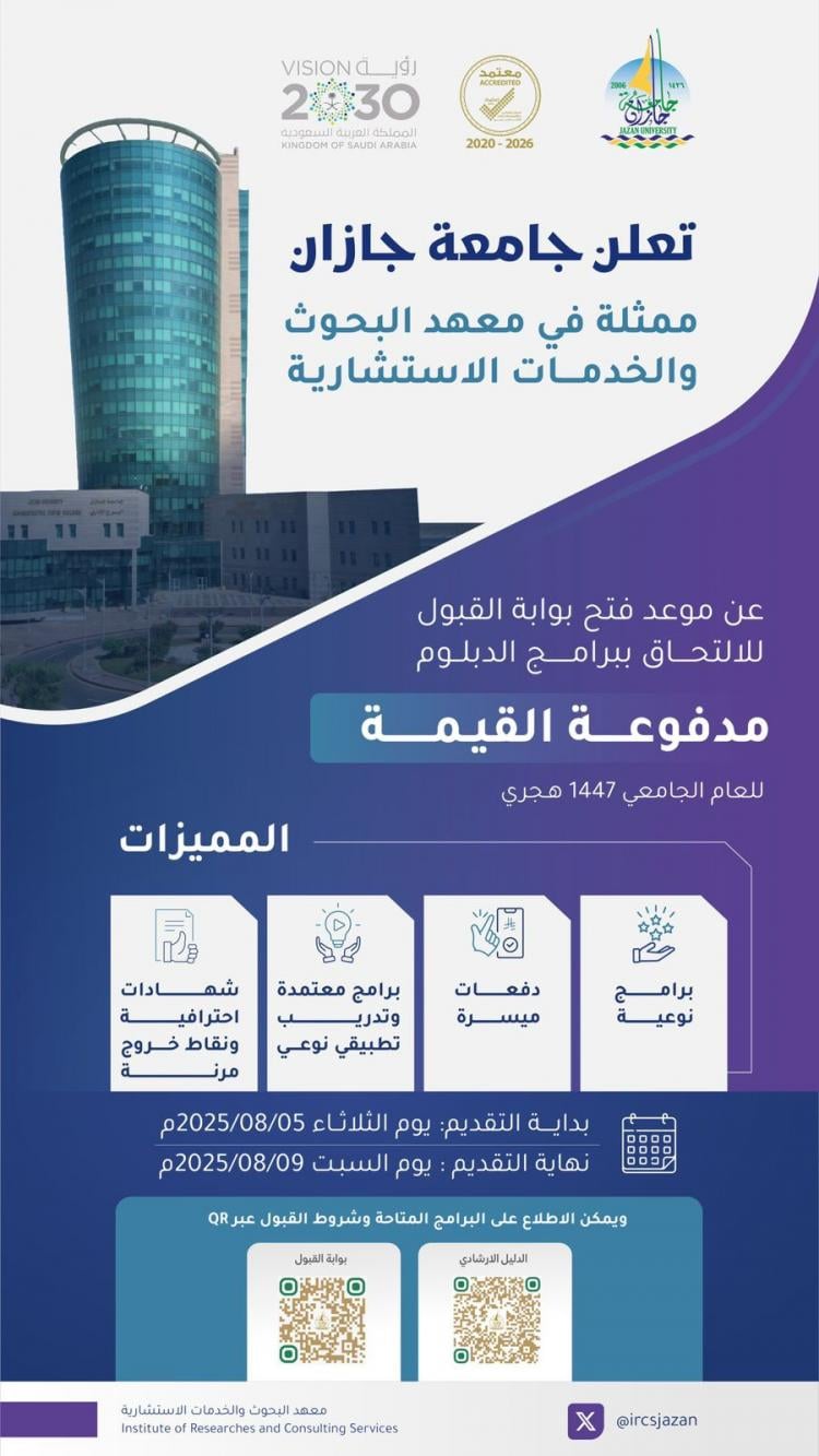 أعلنت جامعة جازان، ممثلة في معهد البحوث والخدمات الاستشارية، عن فتح باب القبول في برامج الدبلومات المدفوعة للعام الجامعي 1447 هـ حيث يبدأ التقديم يوم الثلاثاء الموافق 05/08/2025م، وينتهي يوم السبت الموافق 09/08/2025م.