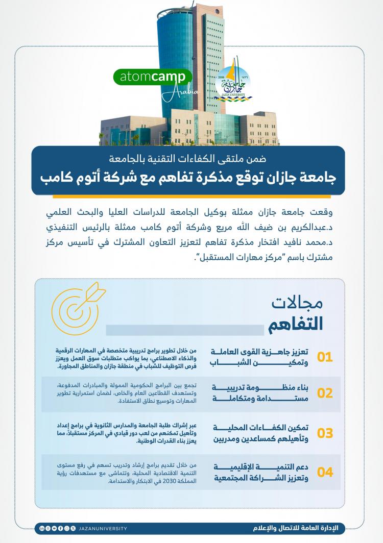 وقَّعت جامعة جازان مذكرة تفاهم مع شركة "أتوم كامب"، بهدف تأسيس مركز مشترك يحمل اسم "مركز مهارات المستقبل".