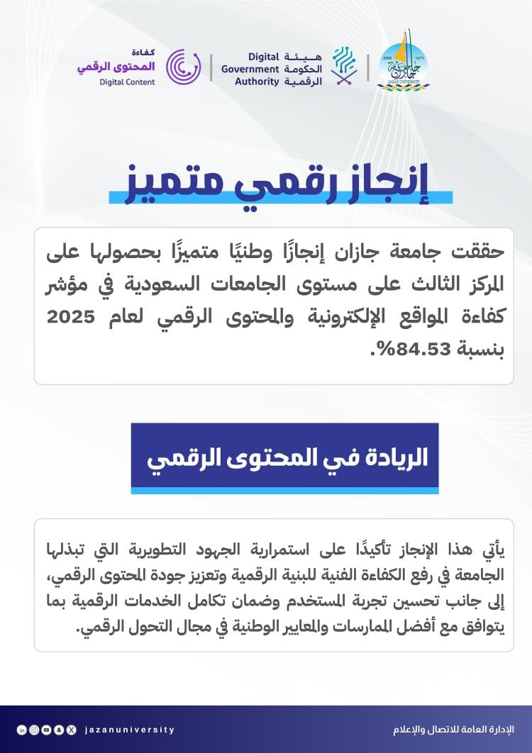 حققت جامعة جازان إنجازًا وطنيًا متميزًا بحصولها على المركز الثالث على مستوى الجامعات السعودية في مؤشر كفاءة المواقع الإلكترونية والمحتوى الرقمي لعام 2025 بنسبة 84.53%، لترتقي بذلك من مستوى "متمكّن" إلى مستوى "متقدّم".