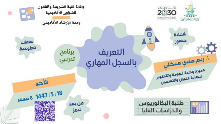 نظمت وكالة كلية الشريعة والقانون للشؤون الأكاديمية، تحت رعاية عميد الكلية د. علي بن طاهر صميلي، دورة تدريبية عن "السجل المهاري للطالب الجامعي" ضمن فعاليات أسبوع المجد٤ قدمتها أ. ريم بنت هادي مدخلي، مديرة وحدة الجودة والتطوير بعمادة القبول والتسجيل، استهدفت طلاب وطالبات البكالوريوس والدراسات العليا.