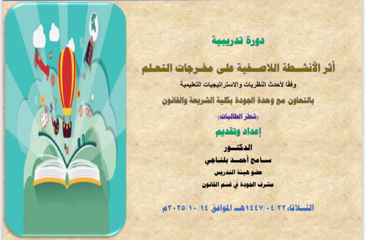نفذت وحدة الجودة والاعتماد الأكاديمي بكلية الشريعة والقانون، ورشة عمل بعنوان: “أثر الأنشطة اللا صفية على مخرجات التعلم” وذلك ضمن جهود الكلية في تطوير العملية التعليمية وتحقيق الجودة الشاملة في البرامج الأكاديمية.
