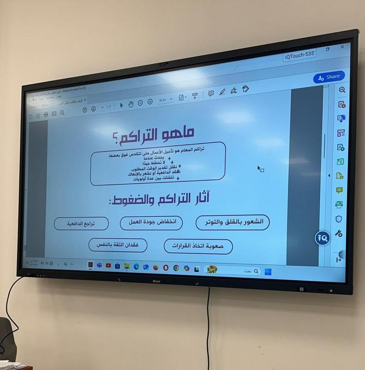ضمن خطة وحدة الإرشاد الأكاديمي بفرع الكلية التطبيقية بالعارضة والتي تهدف إلى معالجة مشكلات الطالبات وتعزيز مهاراتهن في التعامل مع التحديات النفسية نفذت منسقة وحدة العلاقات العامة الأستاذة نورة علي سهلي برنامج عن (تحت السيطرة: كيف تتغلب على التراكم والضغوط) لمنسوبات وطالبات الكلية بهدف يناء وعي أكبر وطرق إدارتها بشكل إيجابي.