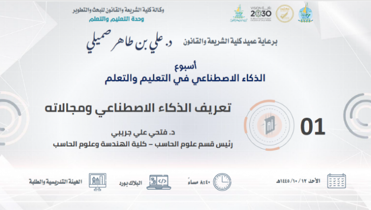 مواكبةً للتقدم التقني الهائل والمتطور في المملكة العربية السعودية في مجال الذكاء الاصطناعي، ولا سيما في مجال التعليم والتعلم؛ وبرعاية كريمة من عميد كلية الشريعة والقانون فضيلة الدكتور/ علي بن طاهر صميلي، نظمت وحدة التعليم والتعلم بكلية الشريعة والقانون أسبوعًا تقنيًّا تدريبيًّا بعنوان: (أسبوع الذكاء الاصطناعي في التعليم والعلم)، في الفترة من 12 إلى 14 شوال 1445هـ، بالتعاون مع قسم علوم الحاسب في كلية الهندسة وعلوم الحاسب ، وكانت الدورة الأولى مع سعادة الدكتور/ فتحي علي جريبي رئيس قسم علوم الحاسب بكلية الهندسة وعلوم الحاسب، بعنوان: (تعريف الذكاء الاصطناعي ومجالاته )، قدم فيها عددًا من أسس هذا المجال، من حيث: تعريف الذكاء الاصطناعي، ومميزاته وعيوبه ومخاطره، موضحًا مجالاته وأهميته وأهدافه وأنواعه ونظمه، ومبرزًا دوره في التعليم والتعلم، مع ذكر عددٍ من النماذج .