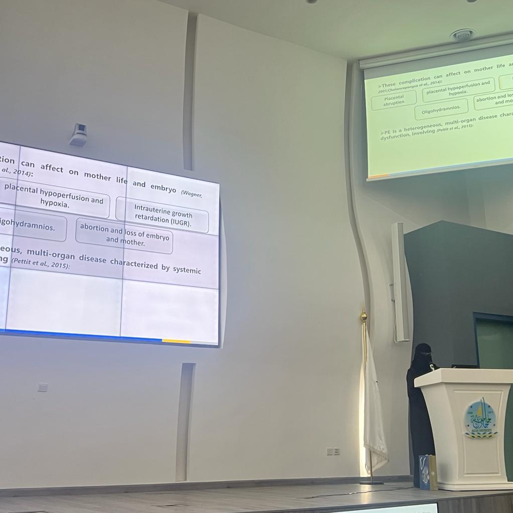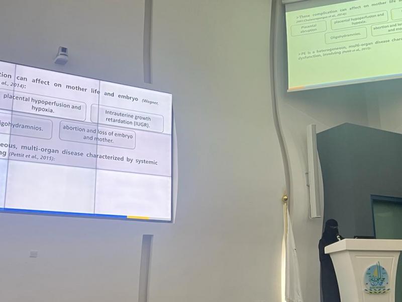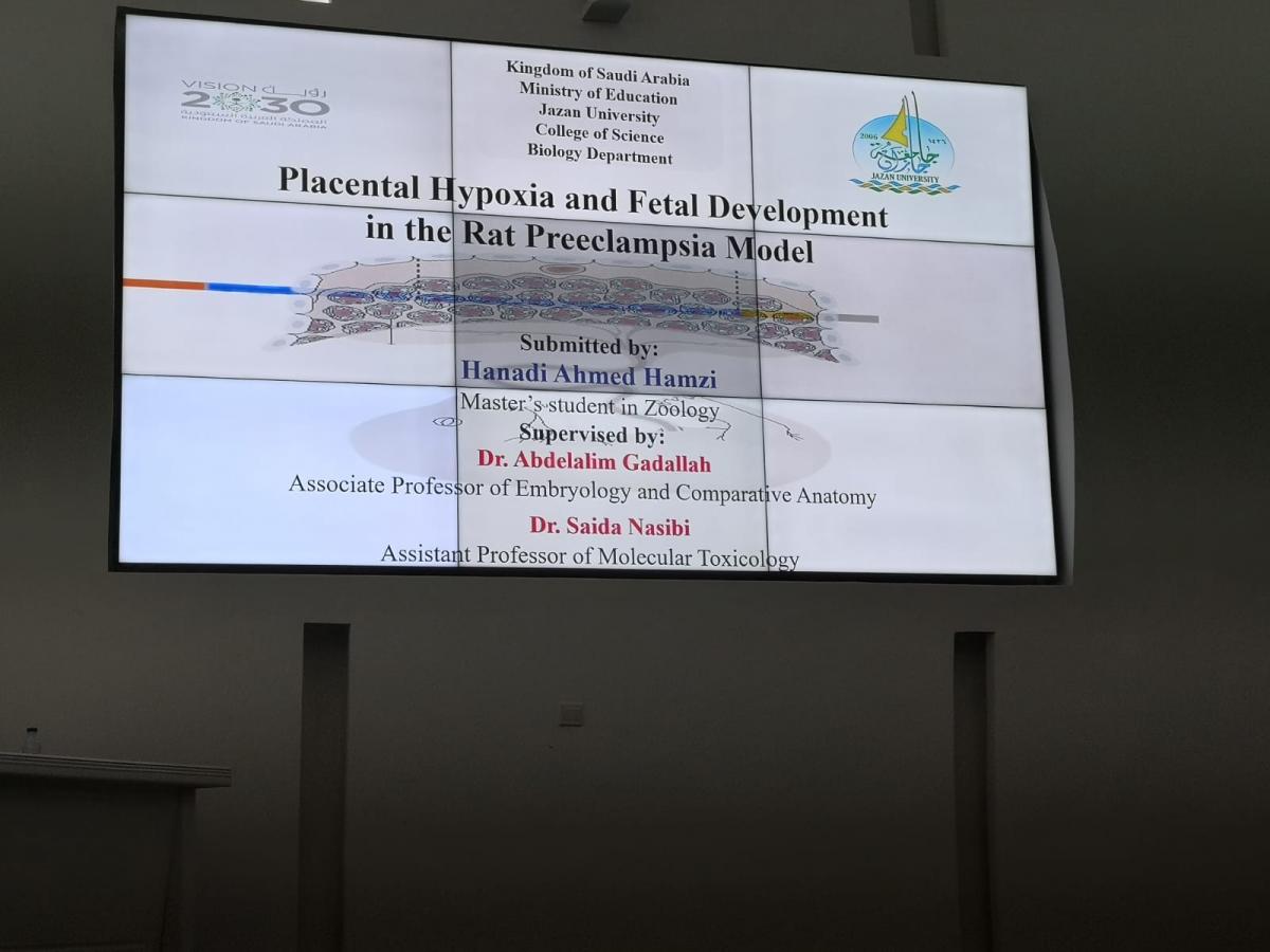 نوقشت رسالة ماجستير الطالبة "هنادي أحمد حمد حمزي" والموسومة بـ (نقص الأكسجين المشيمي والتطور الجنيني في النموذج التجريبي لحالات تسمم ما قبل الحمل في الجرذان)، وذلك يوم الأحد 28 شوال 1443هـ. الموافق 29-5-2022 م. إشراف كل من د. عبد العليم جادالله والدكتورة/ سعيدة نصيبي، وقد تألفت لجنة المناقشة والحكم على الرسالة كل من سعادة: