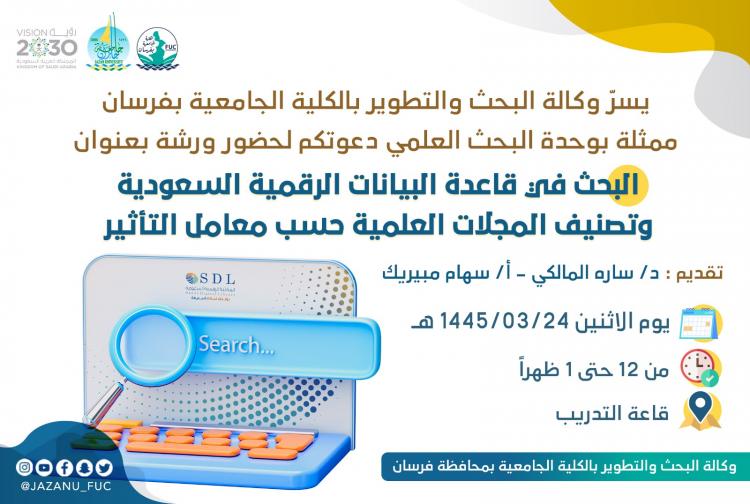 نفذت الكلية الجامعية بفرسان ممثلة في وحدة البحث والتطوير برعاية عميدة الكلية الدكتورة عفاف محمد با بعير وإشراف وكيلة الكلية للشؤون الأكاديمية الدكتورة عيش يحيى مدخلي ورشة عمل بعنوان البحث في قاعدة البيانات الرقمية السعودية وتصنيف المجلات العلمية حسب معامل التأثير من إعداد وتنفيذ الدكتورة سارة المالكي والأستاذة سهام مبيريك في قاعة التدريب بالكلية وعالجت الورشة التعريف بخدمات المكتبة الرقمية السعودية وآلية الدخول على قاعدة البيانات والبحث عنها والتفريق بين أنواع المجالات العلمية ذات معامل التأثير حسب تصنيف lsl و scopus بعدها قام الحضور بتطبيق عملي للدخول على قاعدة البيانات والبحث فيها وانتهى الحديث عن كيفية الكشف عن المجلات الوهمية وآلية تجنبها.