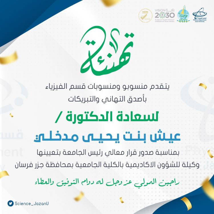وبهذه المناسبة يتقدم منسوبو ومنسوبات قسم الفيزياء بأصدق التهاني والتبريكات لسعادة الدكتورة / عيش مدخلي متمنيا لها دوام التوفيق والنجاح.