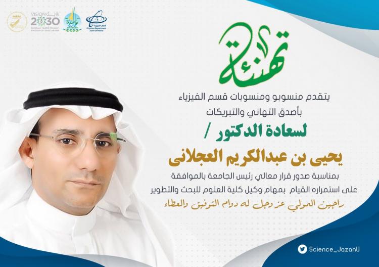 صدور قرار معالي رئيس الجامعة بالموافقة على استمرار الدكتور يحيى العجلاني للقيام بمهام وكيل كلية العلوم للبحث والتطوير.