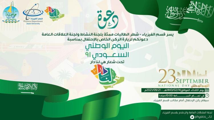 تحت شعار "هي لنا دار" اقام قسم الفيزياء-شطر الطالبات ممثلا بلجنة النشاط و لجنة العلاقات العامة ركن خاص للإحتفال بمناسبة العيد الوطني السعودي 91. اقيمة هذه الفاعلية يوم الثلاثاء الموافق 1443/2/14هـ الموافق 2021/9/21 في تمام الساعة 10 صباحا امام مكاتب قسم الفيزياء. مشاهدة فيديو الفاعلية