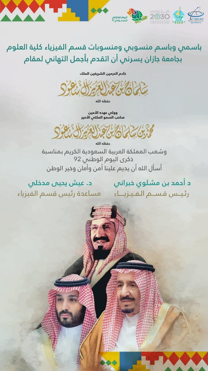 تهنئة من منسوبي ومنسوبات قسم الفيزياء بمناسبة اليوم الوطني 92