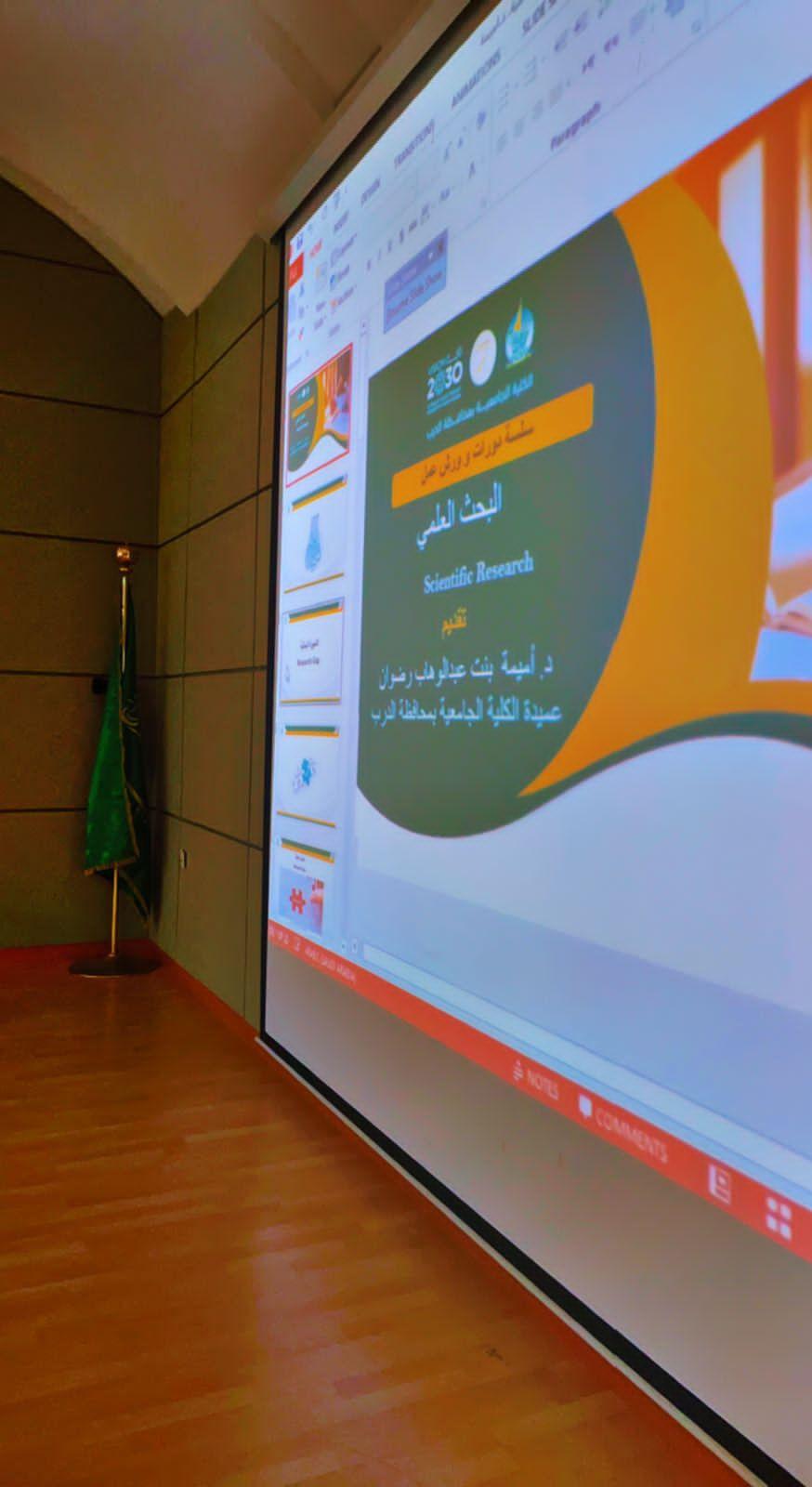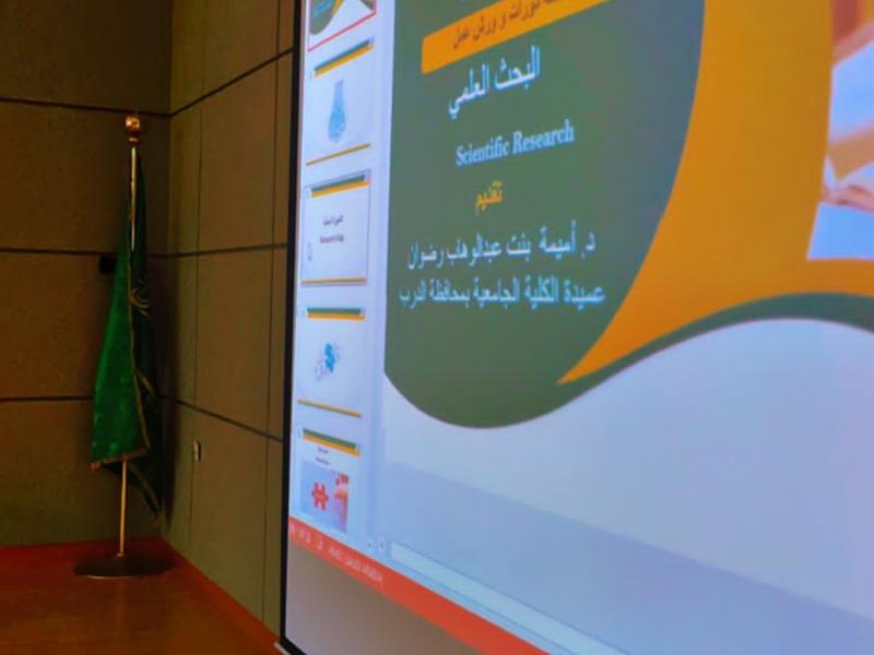أقامت الكلية الجامعية بالدرب يوم الخميس الموافق 14 /5/ 1444هـ (ورش عمل لتعزيز مخرجات البحث العلمي ) برعاية سعادة عميدة الكلية د.أميمة عبدالوهاب رضوان ، و بحضور منسوبات الكلية