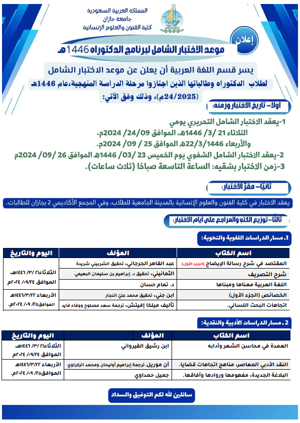 إعلان موعد الاختبار الشامل 1446هـ لطلاب وطالبات الدكتوراه بقسم اللغة العربية