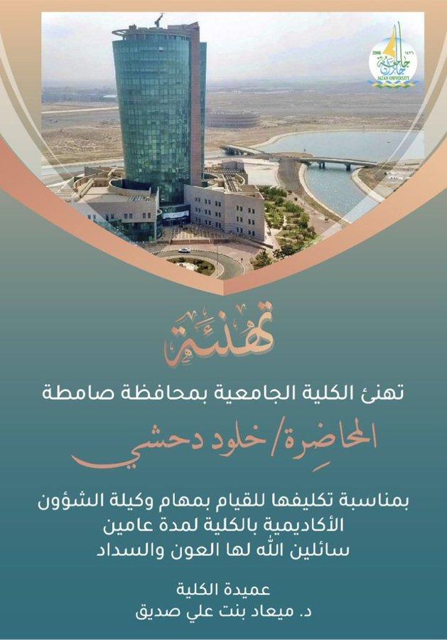 تهنئ الكلية الجامعية بمحافظة صامطة المحاضرة خلود دحشي بمناسبة تكليفها للقيام بمهام وكيلة الشؤون الأكاديمية بالكلية سائلين الله لها العون والتوفيق.
