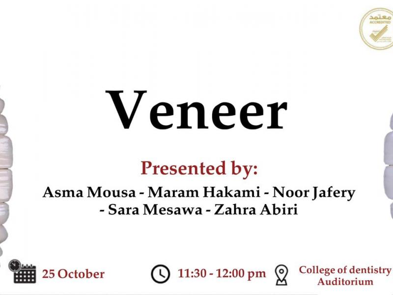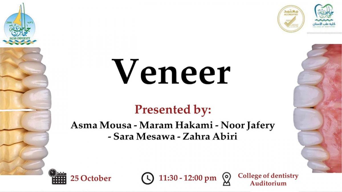 يقدم طلاب الامتياز محاضرة بعنوان (veneer) يتحدثون فيها عن استعمال القشور التجميلية الخزفية للأسنان ودواعي استعمالها.