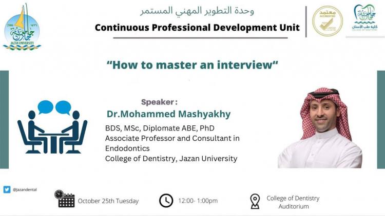 و من ثم تليها محاضرة يقدمها الدكتور/ محمد بن حمد مشيخي يتحدث فيها عن كيفية إتقان المقابلات الشخصية، وذلك في تمام الساعة 12:00 - 1:00 مساءاً على مسرح الكلية.