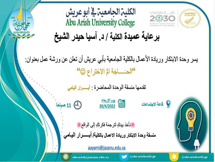 نظمت وحدة الابتكار وريادة الأعمال اليوم الخميس الموافق 21/4/2022 ورشة عمل بعنوان (الحاجة أم الاختراع) بالتزامن مع اليوم العالمي للابتكار وريادة الأعمال، والتي قدمتها منسقة الوحدة م. أبرار اليامي بقاعة الاجتماعات بالكلية.