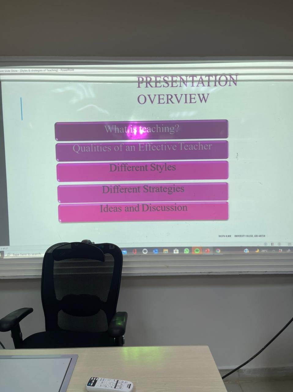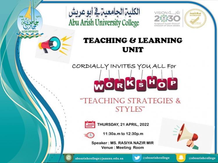 نظمت وحدة التعليم والتعلم بالكلية الجامعية بأبو عريش ورشة عمل بعنوان " استراتيجيات التدريس" لأعضاء هيئة التدريس قدمتها منسقة وحدة التعليم والتعلم د. راسيا نزير احمد مير يوم الخميس الموافق 21/4/2022م من الساعة 11:30صباحًا حتى 12:30 ظهرًا في قاعة الاجتماعات بالكلية وتضمنت الورشة عدة محاور وهي كالآتي: