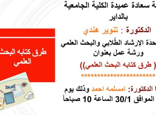 جامعة جازان: إدارة الإعلام قدمت وحدة الإرشاد الطلابي في الكلية الجامعية بالداير ورشة عمل بعنوان طرق كتابة البحث العلمي قدمتها دكتورة أم سلمة أحمد تناولت أهمية البحث العلمي وأن البحوث العلمية تعتبر المرآة العاكسة لمستوى وطبيعة التطور الحاصل لأي دولة