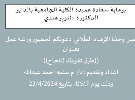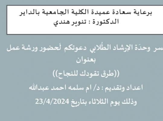 ضمن الخطة التنفيذية لعمادة شؤون الطلاب وتحت رعاية سعادة عميدة الكلية الجامعية بمحافظة الداير الدكتورة تنوير احمد هندي قدمت وحدة الارشاد الطلابي بالكلية الجامعية بالداير ورشة عمل بعنوان (طرق تقودك لتحصيل دراسي فعال) وذلك يوم الثلاثاء الموافق 22/4