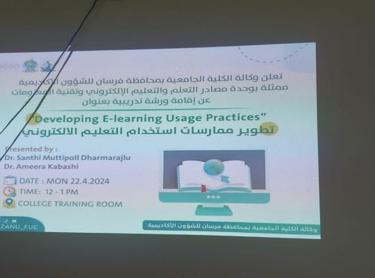 جامعة جازان: إدارة الإعلام أقامت الكلية الكلية الجامعية بفرسان ممثلة في وحدة التعلم برعاية عميدة الكلية الدكتورة عفاف با بعير وإشراف وكيلة الكلية للشؤون الأكاديمية الدكتورة عيش مدخلي ورشة عمل بعنوان : تطوير ممارسات استخدام التعلم الالكتروني من إعداد